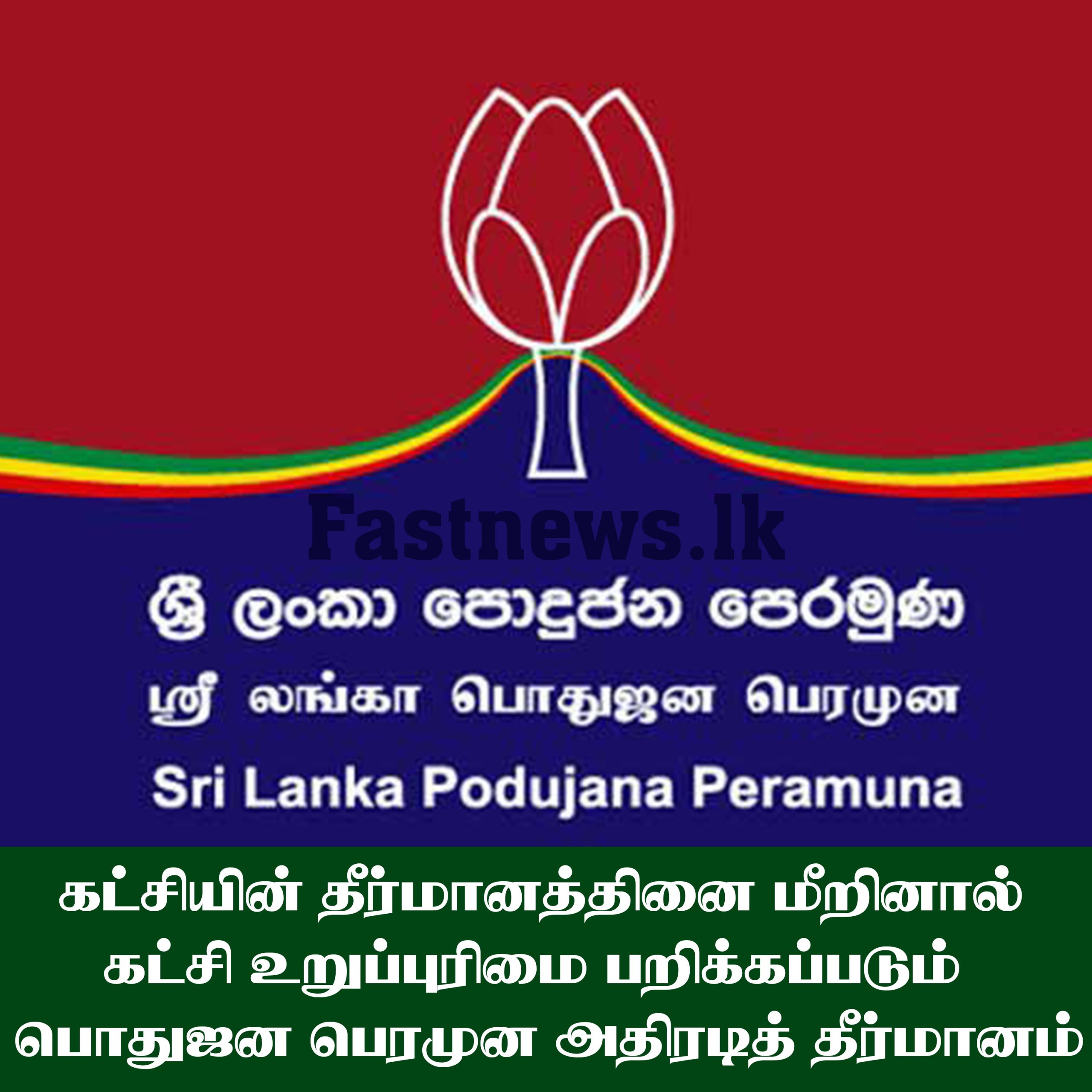 மேலும், ஸ்ரீலங்கா பொதுஜன பெரமுனவின் ஜனாதிபதி வேட்பாளரை தவிர வேறு எந்த வேட்பாளரையும் நேரடியாகவோ அல்லது மறைமுகமாகவோ ஆதரிக்கும் அல்லது கட்சி எடுக்கும் முடிவுகளுக்கு எதிராக செயல்படும் எந்தவொரு கட்சி உறுப்பினருக்கும் இது பொருந்தும் என்றும் தீர்மானிக்கப்பட்டுள்ளது.