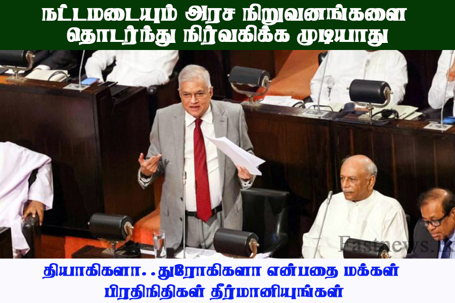 (ஃபாஸ்ட் நியூஸ் | கொழும்பு) – நட்டமடையும் அரச நிறுவனங்களை தொடர்ந்து நிர்வகிக்க முடியாதென்றும் நரகத்தில் ஓய்வு நிலையில் உள்ளோம். வரலாற்றில் துரோகிகளாக அடையாளப்படுத்தப்படுவதா? அல்லது தியாகிகளாக அடையாளப்படுத்தப்படுவதா ? என்பதை மக்கள் பிரதிநிதிகள் தீர்மானித்துக் கொள்ள வேண்டும். பொருளாதார மீட்சிக்காக முன்னெடுத்துள்ள நடவடிக்கைகளுக்கு அனைவரும் ஒத்துழைப்பு வழங்க வேண்டும் என ஜனாதிபதி எதிர்க்கட்சிகளுக்கு அழைப்பு விடுத்தார்.