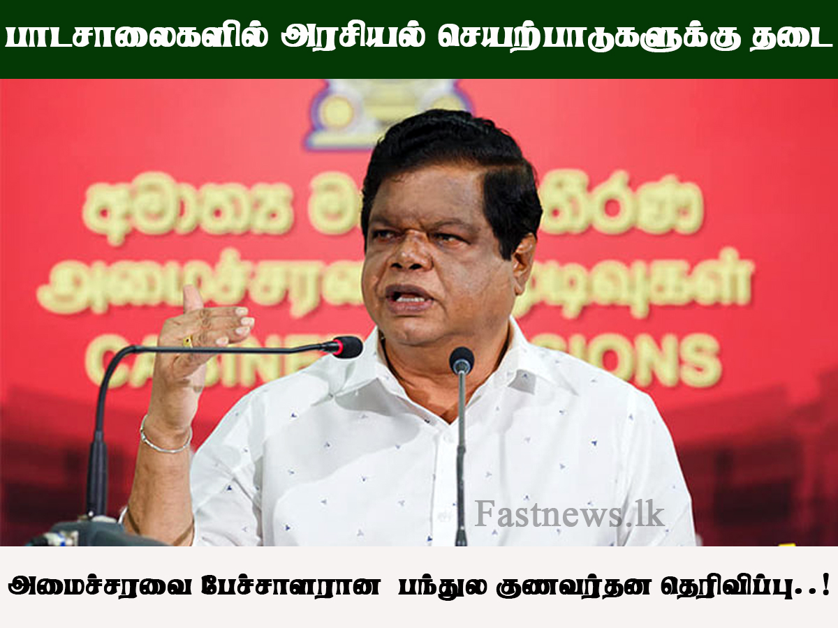 (ஃபாஸ்ட் நியூஸ் | கொழும்பு) – பாடசாலைகள் மற்றும் பாடசாலை வளாகங்களை அரசியல் செயற்பாடுகளுக்காக பயன்படுத்துவதற்கு தடைவிதிக்கும் அதிகாரத்தை மாகாண ஆளுநர்களுக்கு வழங்குவதற்கான யோசனைக்கு அமைச்சரவை அங்கீகாரம் வழங்கியுள்ளது.