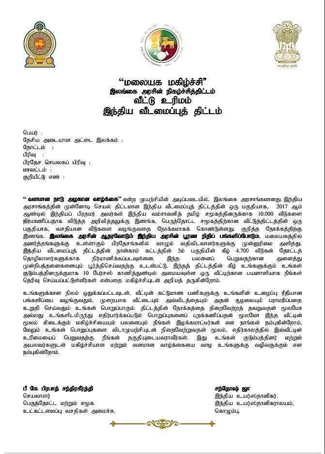 – ஒருவர் இந்திய வீட்டுத் திட்டத்தின், முன்நிபந்தனைகள் நிறைவேற்றப்படும் பட்சத்தில் (முன்நிபந்தனைகள் எவை என்பது பற்றிய விபரங்கள் இல்லை) கீழ் 10 பேர்ச் (1 பரப்பு) காணியில் வீடு ஒன்றினைப் பெறுவதற்கு சாத்தியமான பயனாளியாக (potential beneficiary) தெரிவுசெய்யப்பட்டுள்ளார் என்பதனை அறிவிக்கின்ற கடிதமாகவே இது அமைகிறது.