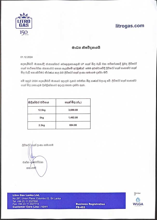 (ஃபாஸ்ட் நியூஸ் | கொழும்பு) – லிட்ரோ சமையல் எரிவாயுவின் விலை குறித்த அறிவிப்பை அந்நிறுவனம் வெளியிட்டுள்ளது.