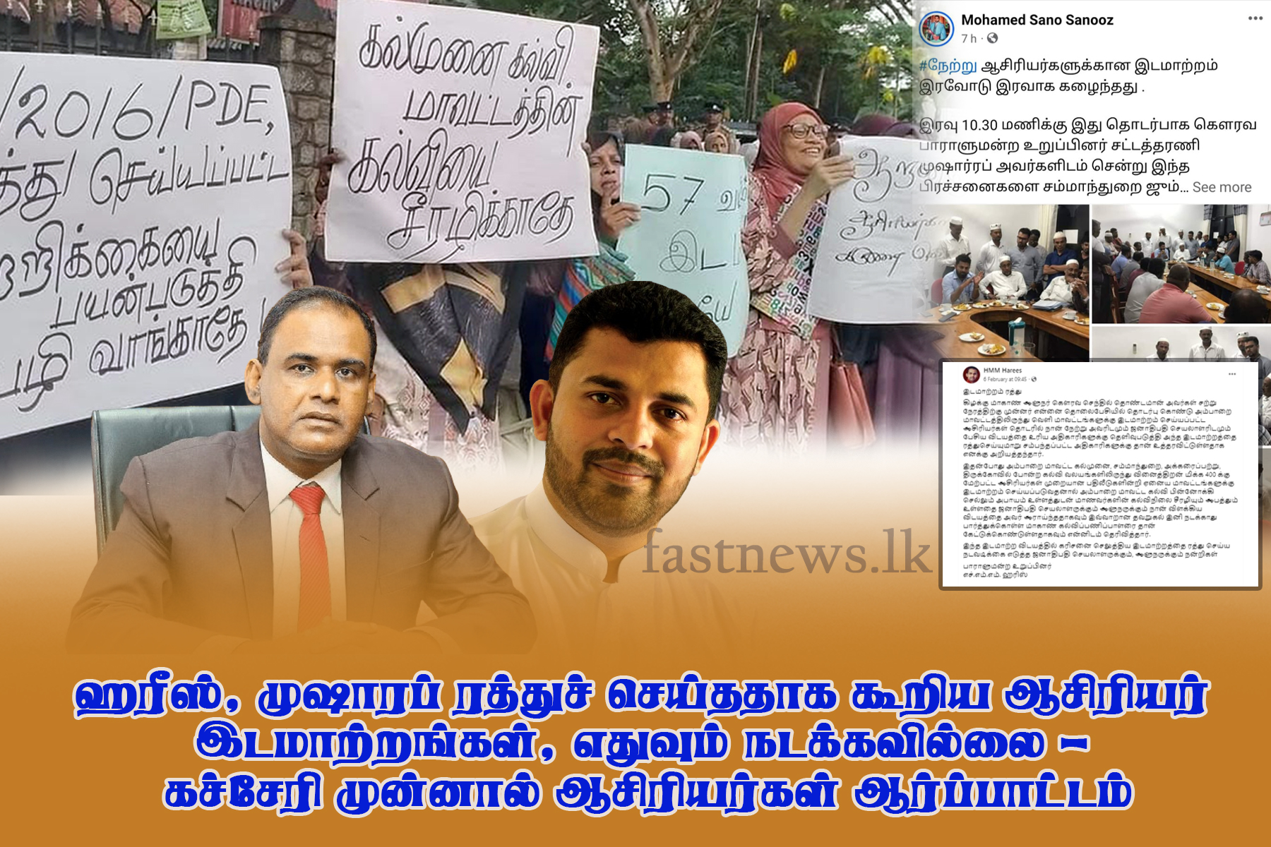 அம்பாறை மாவட்ட ஆசிரியர்களுக்கு வெளிமாவட்டங்களுககு வழங்கப்பட்ட இடமாற்றங்களை, கிழக்கு மாகாண ஆளுநருடன் பேசி தாமே ரத்துச் செய்ததாக நாடாளுமன்ற உறுப்பினர் ஹரீஸ் மற்றும் முஷாரப் ஆகியோர் ஏட்டிக்குப் போட்டியாக சமூக ஊடகங்களில் பகிரங்கமாகத் அறிவித்திருந்த நிலையிலேயே, ஆசிரியர்கள் இவ்வாறு இடமாற்றங்களை ரத்துச் செய்யுமாறு கோரி ஆர்ப்பாட்டம் நடத்தியுள்ளனர்.