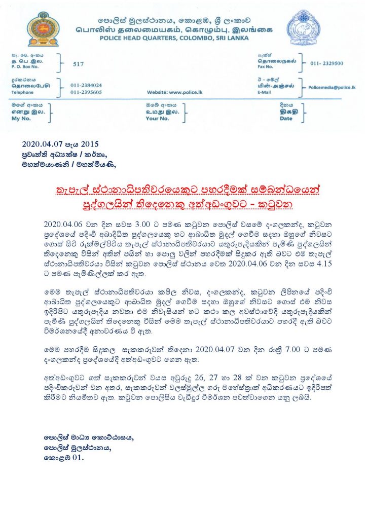 (ෆාස්ට් නිව්ස් | කොළඹ) – රුක්මල්පිටිය තැපැල් ස්ථානාධිපතිවරයාට පහරදීමේ සිද්ධිය සම්බන්ධයෙන් සැකපිට පුද්ගලයන් 3 දෙනෙකු අත්අඩංගුවට ගෙන තිබේ.
