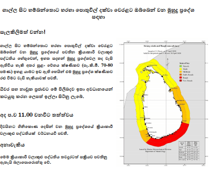 (ෆාස්ට් නිව්ස් | ගාල්ල) – ගාල්ල සිට හම්බන්තොට හරහා පොතුවිල් දක්වා වෙරළට ඔබ්බෙන් වන මුහුදු ප්රදේශයේ සුළගේ වේගය පැයට කිලෝමීටර් 70ත් 80ත් අතර ඉහළ යා හැකි බව කාලගුණ විද්යා දෙපාර්තමේන්තුව නිවේදනය කරයි.