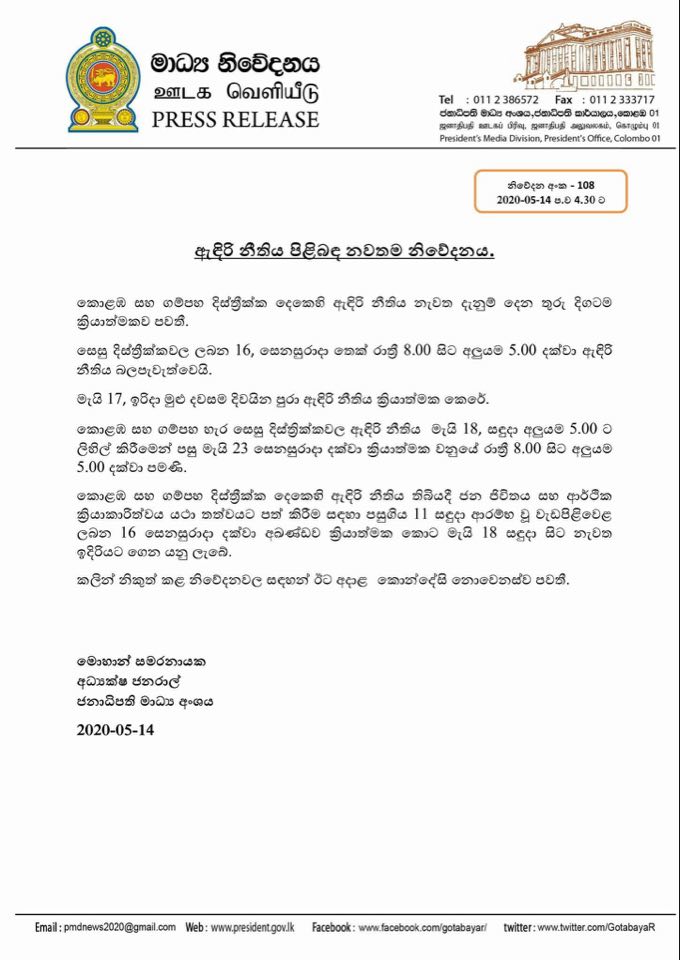 කොළඹ ගම්පහ හැර සෙසු දිස්ත්රික්වල ඇඳිරි නීතිය මැයි 18 සඳුදා අලුයම 5.00 ට ලිහිල් කිරීමෙන් පසු මැයි 23 වන සෙනසුරාදා දක්වා ක්රියාත්මක වන්නේ රාත්රී 8.00 සිට පසුදා අලුයම 5.00 දක්වා පමණයි.