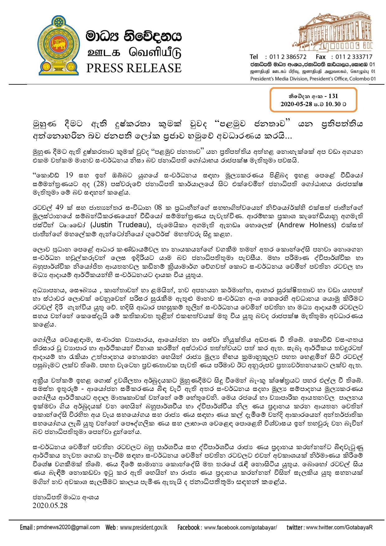 “කොව්ඩ් 19 සහ ඉන් ඔබ්බට යුගයේ සංවර්ධනය සඳහා මූල්යකරණය පිළිබද ඉහළ පෙළේ වීඩියෝ සම්මන්ත්රණයට ජනාධිපති කාර්යාලයේ සිට එක්වෙමින් ජනාධිපති ගෝඨාභය රාජපක්ෂ මැතිතුමා මේ බව සඳහන් කළේය.