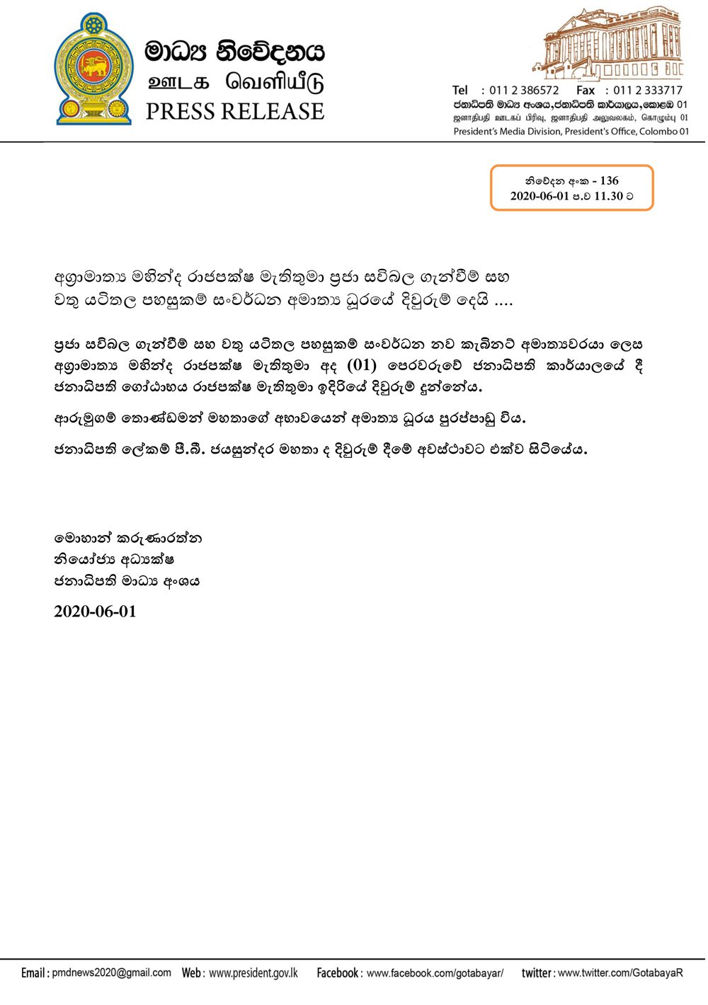 (ෆාස්ට් නිව්ස් | කොළඹ) – අභාවප්රාප්ත අමාත්ය අරුමුගම් තොණ්ඩමන් දැරූ ප්රජා සවිබලගැන්වීමේ හා වතු යටිතල පහසුකම් අමාත්ය ධුරයේ, අගමැති මහින්ද රාජපක්ෂ දිවුරුම් දී තිබේ.