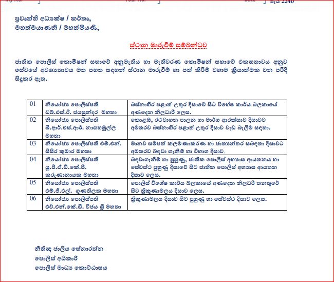 ජාතික පොලිස් කොමිෂන් සභාවේ අනුමැතිය හා මැතිවරණ කොමිෂන් සභාවේ එකඟතාවය මත වහාම ක්රියාත්මක වන පරිදි අදාල ස්ථාන මාරු සිදුකර ඇති බව පොලිස් මාධ්ය කොට්ඨාසය සඳහන් කළේය.