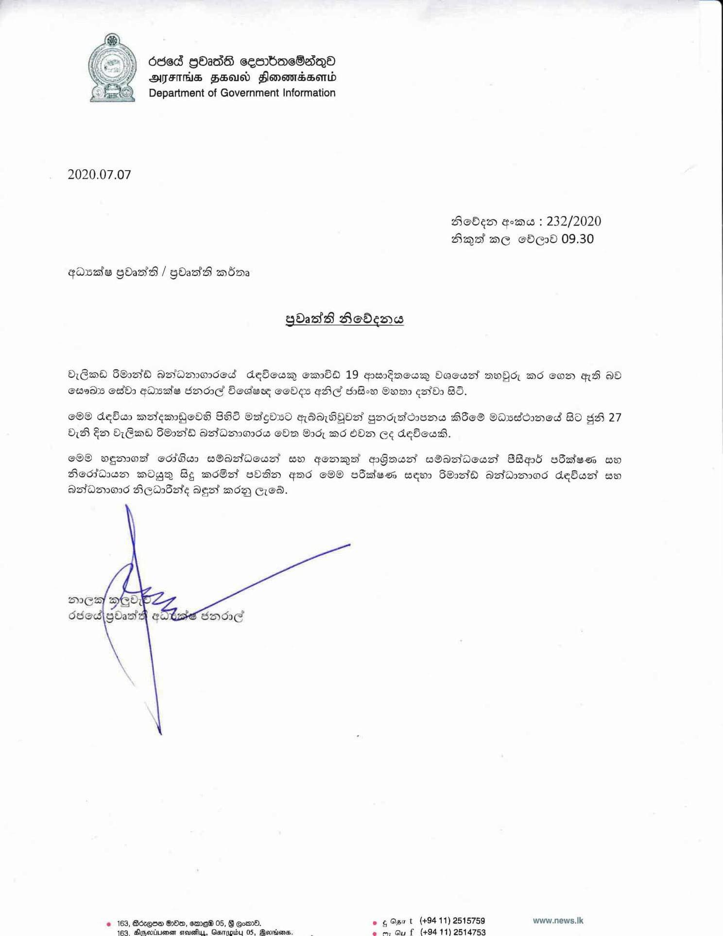 වැලිකඩ රිමාන්ඩ් බන්ධනාගාරයේ රැඳවියෙකුට කොරෝනා [PRESS RELEASE]
