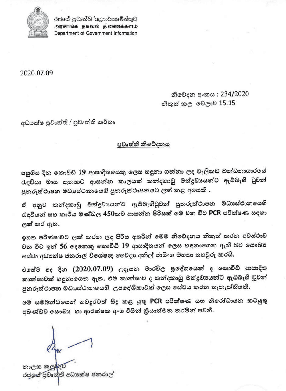 එම පුනරුත්ථාපන මධ්යස්ථානයේ රැඳවියන් සහ කාර්ය මණ්ඩලයේ 450කට ආසන්න පිරිසක් පී සී ආර් පරීක්ෂණවලට ලක් කර ඇති අතර එහිදීයි මෙම තොරතුරු අනාවරණ වී ඇත.