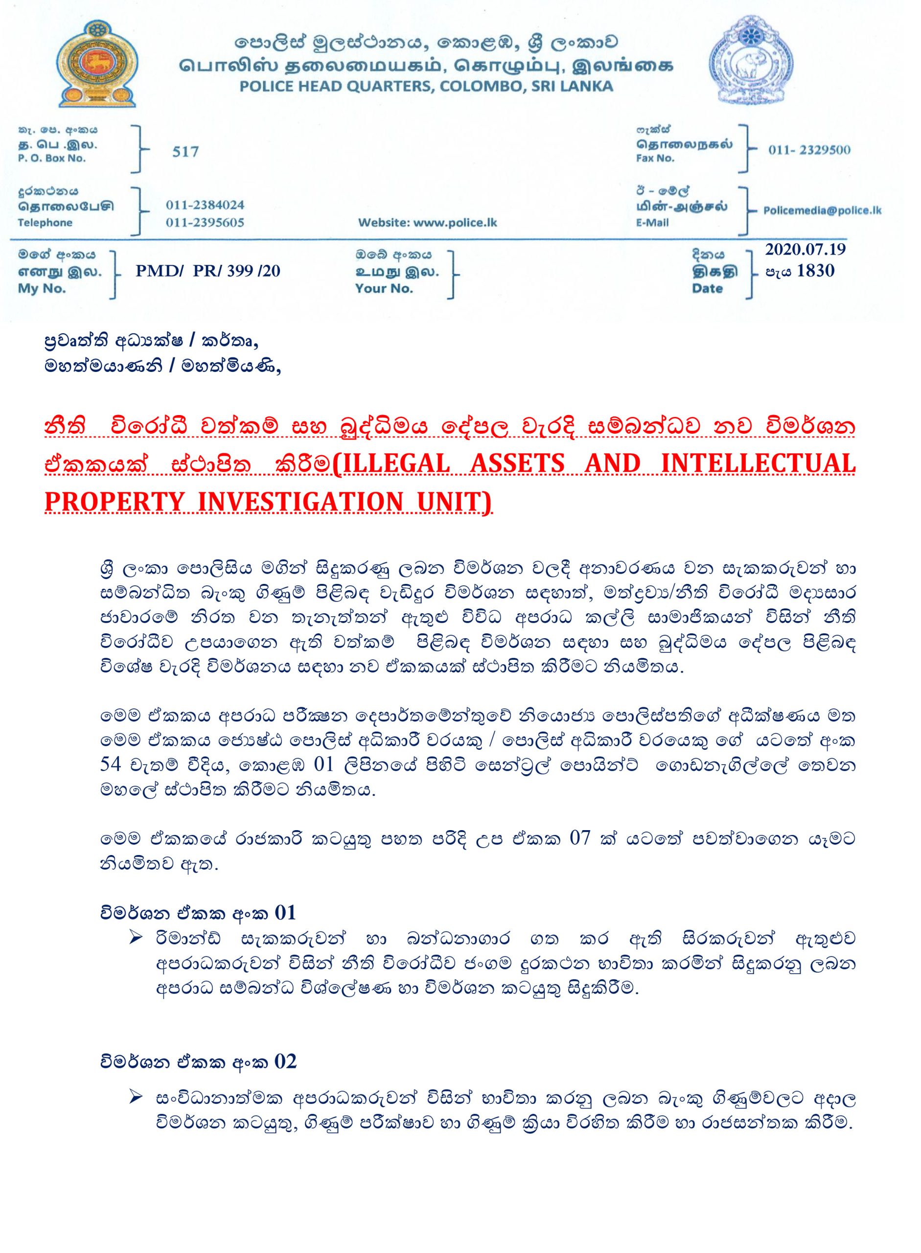 (ෆාස්ට් නිව්ස් | කොළඹ) – නීති විරෝධී වත්කම් විමර්ශනය සඳහා වන විශේෂ පොලිස් ඒකකයට අදාළ චක්රලේඛය නිකුත් කර තිබෙන බව පොලිස් මාධ්ය ප්රකාශක ජෙෂ්ඨ පොලිස් අධිකාරී ජාලිය සේනාරත්න මහතා සඳහන් කළේය.
