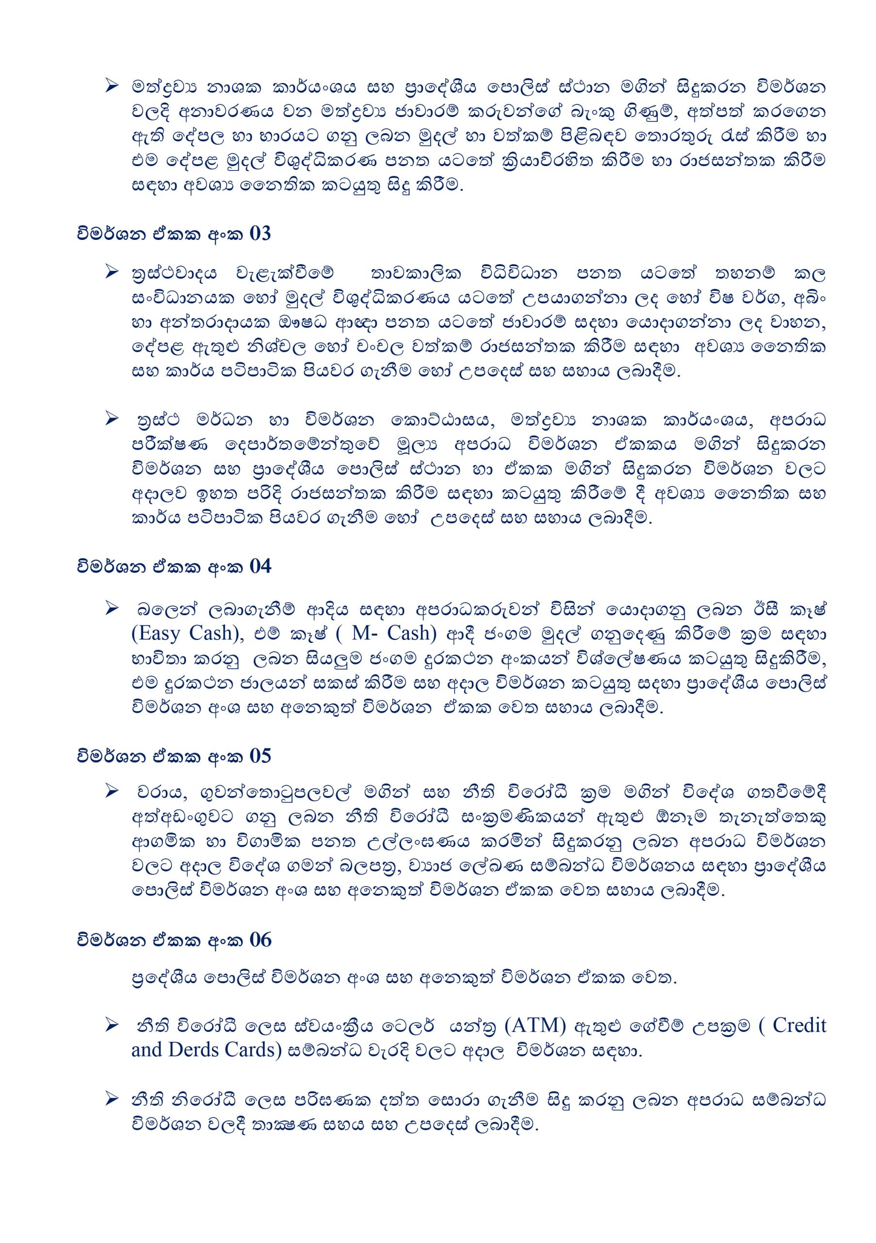 මත්ද්රව්ය ජාවාරම්කරුවන් විසින් සිදුකරනු ලබන මුදල් ගනුදෙනු, මුදල් විශුද්ධිකරණය, බුද්ධිමය දේපල අවභාවිතය, ඇතුළු කරුණු කිහිපයක් සම්බන්ධයෙන් වැඩිදුර විමර්ශන සිදුකිරීමට අදාළව නව ඒකකය මඟින් විශේෂඥ උපදෙස් ලබාදීමට නියමිතය.#