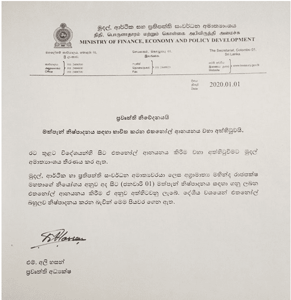 (ෆාස්ට් නිව්ස් | කොළඹ) – 2020 ජනවාරි 1 සිට මෙරටට එතනෝල් ගෙන්වීම තහනම් කර තිබේ.
