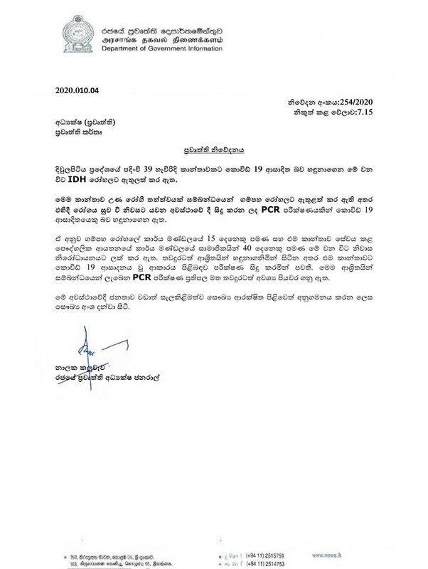 මෙම කාන්තාව උණ රෝගී තත්ත්වයක් සම්බන්ධයෙන් ගම්පහ රෝහලට ඇතුළත් කර ඇති අතර එහිදී රෝගය සුව වී නිවසට යවන අවස්ථාවේදී සිදු කරන ලද PCR පරීක්ෂණයකදී කොවිඩ් 19 ආසාදිතයෙකු බව හඳුනාගෙන ඇත.