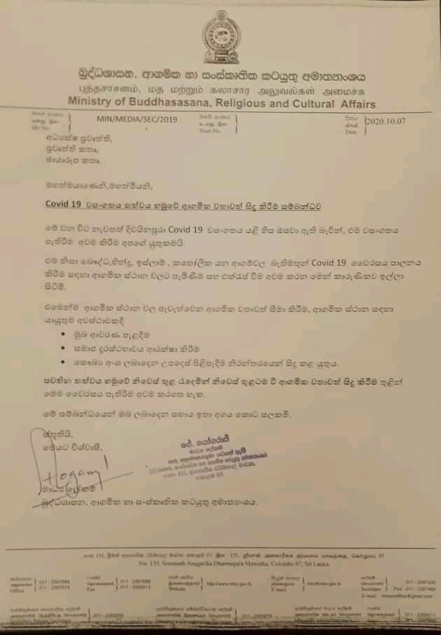 (ෆාස්ට් නිව්ස් | කොළඹ) – කොවිඩ් 19 හේතුවෙන් බෞද්ධ,හින්දු,ඉස්ලාම්,කතෝලික ආගමික ස්ථානවලට පුද්ගලයින් පැමිණීම සහ එක්රැස්වීම සීමා කරන මෙන් බෞද්ධ ආගමික හා සංස්කෘතික අමාත්යංශය නිවේදනය කරයි.