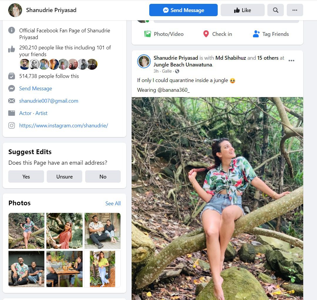 මේ අතරතුර ජනප්රිය රංගන ශිල්පිනියක වන ශනුද්රි ප්රියසාද් තමන් කොළඹින් බැහැරව ගොස් ඇති බවට ෆේස්බුක් ඔස්සේ ඡායාරූප ද පළ කරමින් සඳහන් කර තිබේ.