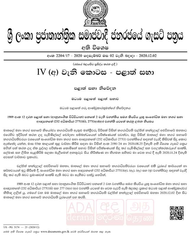 ඒ බව ගැසට් නිවේදනයක් මඟින් ඊයේ (02) නිකුත් කර තිබුණි.