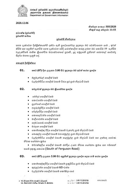 රජයේ ප්‍රවෘත්ති දෙපාර්තමේන්තුව නිවේදනය කළේ කොළඹ දිස්ත්‍රික්කයේ බ්ලුමැන්ඩල් පොලිස් වසම සහ වැල්ලම්පිටිය පොලිස් වසමේ විජය පුර ග්‍රාම නිලධාරී වසමේ සංචරණ සීමා ඉවත් කරන බවයි.
