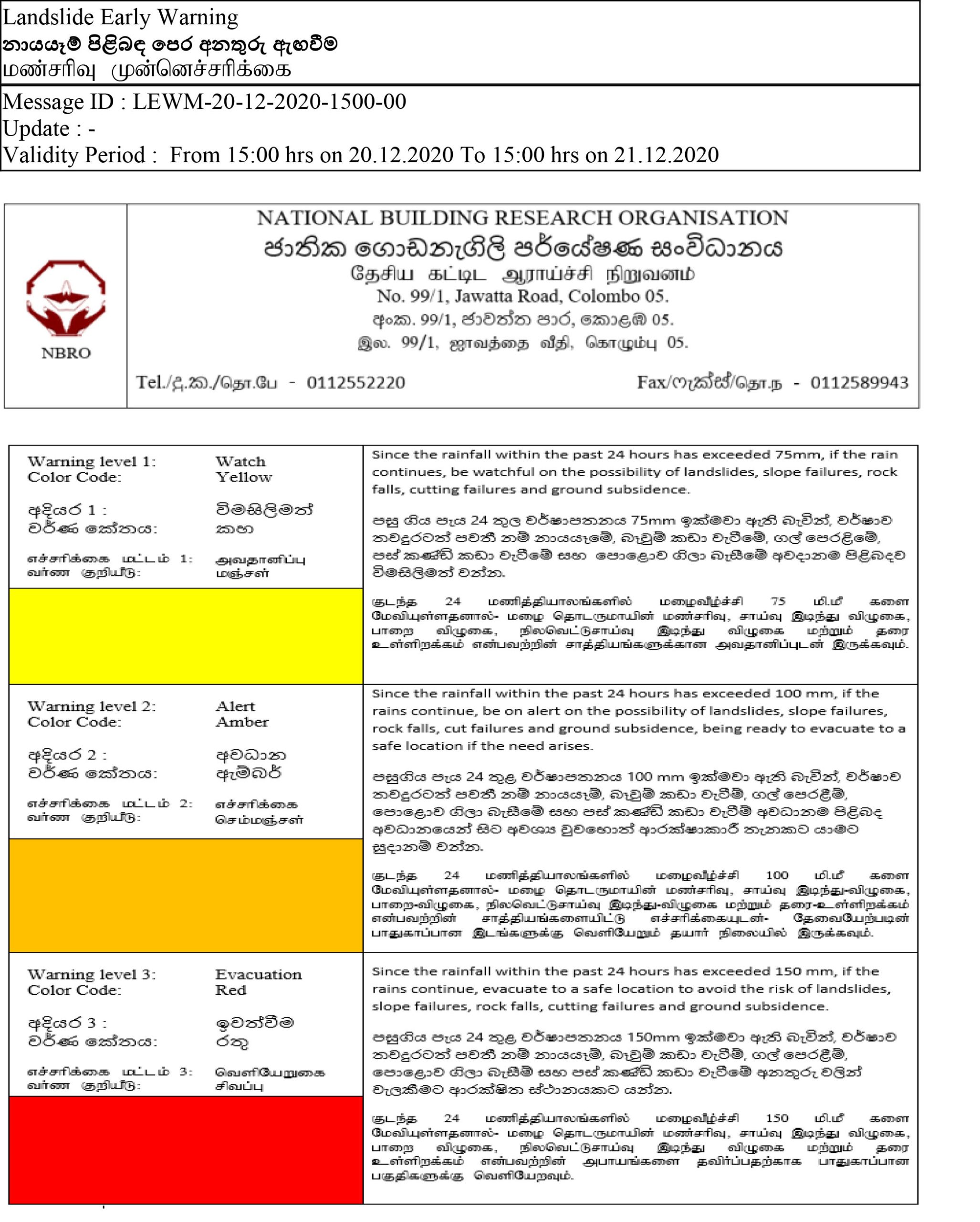 ජාතික ගොඩනැගිලි පර්යේෂණ සංවිධානය සඳහන් කළේ අද පස්වරු තුනේ සිට හෙට පස්වරු තුන දක්වා මෙම නායයෑමේ අවදානම බලාත්මකව පවතින බවයි.