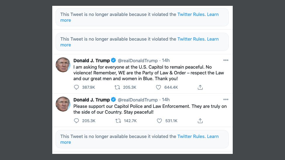 ට්‍රම්ප්ගේ ට්විටර් තහනම සිකුරාදා බදාදා පණිවුඩ කිහිපයක් ට්වීට් කිරීමෙන් පසුවයි‍. එක්සත් ජනපද කැපිටල් නගරයට පහර දුන් පුද්ගලයින් “දේශප්‍රේමීන්” ලෙස හැඳින්වීමට ට්‍රම්ප් ට්වීට් කර තිබුණා.