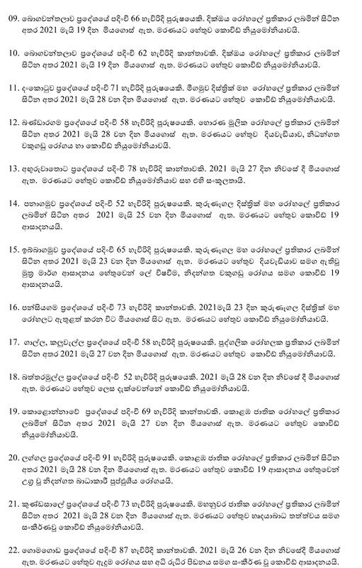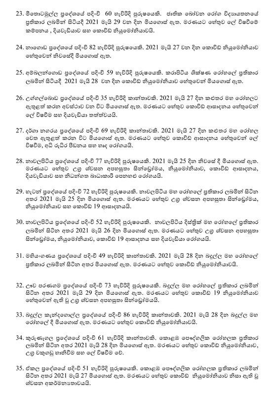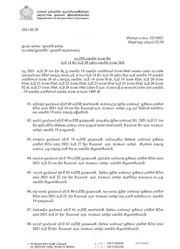 ඒ අනුව මෙරට සමස්ත කොවිඩ් ආසාදිත මරණ 1,405ක් ලෙස වාර්තා වී ඇති බව සෞඛ්‍ය සේවා අධ්‍යක්ෂ වෛද්‍ය ජනරාල් අසේල ගුණවර්ධන මහතා පවසයි.