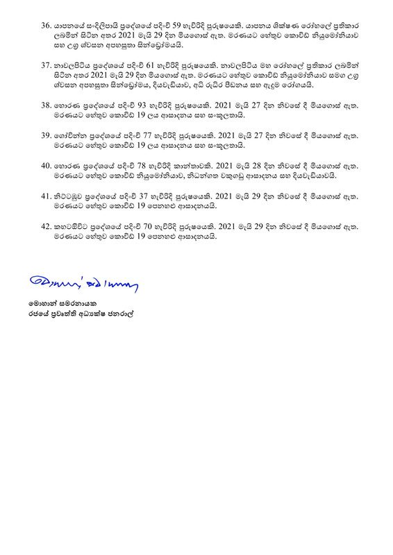 අද තහවුරු කළ මරණ 42න් 29 දෙනෙකු පිරිමි පුද්ගලයින් වන අතර සෙසු 13 දෙනා කාන්තාවන් වන බව රජයේ ප්‍රවෘත්ති දෙපාර්තමේන්තුව සඳහන් කළේය.