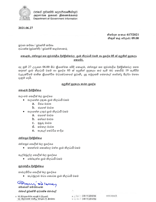 කොළඹ, නුවර එළිය, සහ රත්නපුර යන දිස්ත්රික්කවල ග්රාම නිලධාරී වසම් කිහිපයක් මෙලෙස හුදෙකලා කරනු ඇති.