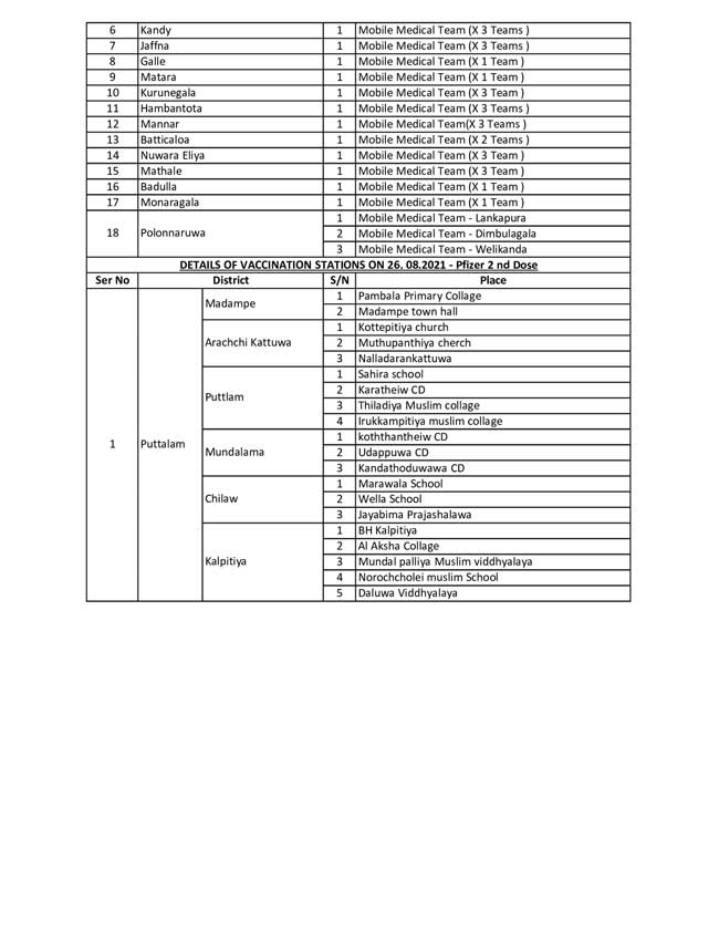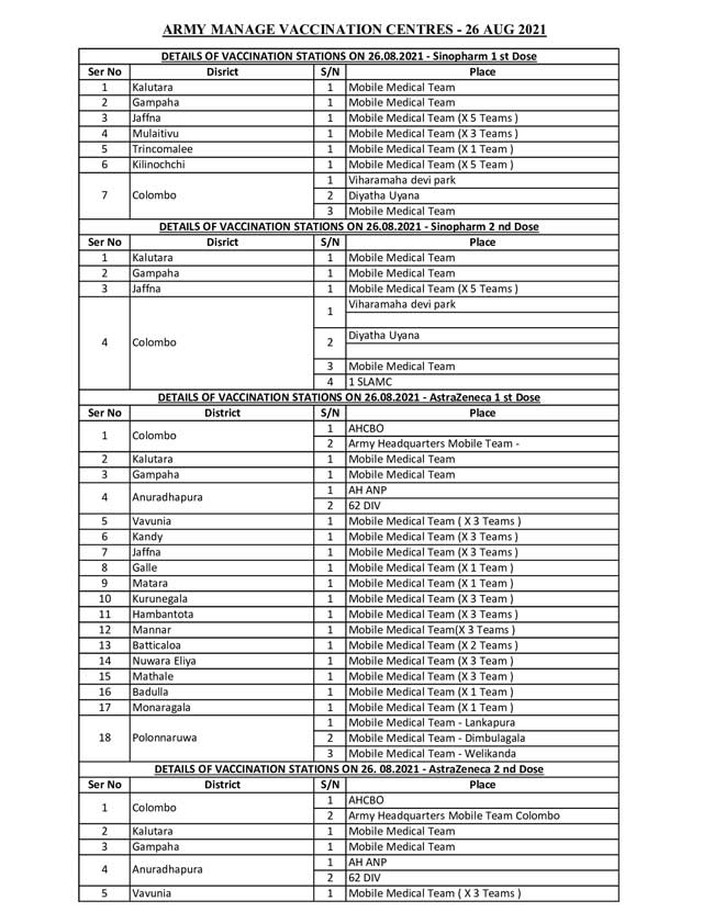 ඒ අනුව ශ්‍රී ලංකා යුද හමුදාව විසින් ක්‍රියාත්මක කරන කොවිඩ් එන්නත්කරණ කටයුතු පහත සඳහන් ස්ථානවලදී සිදුවේ.