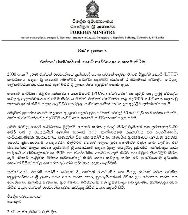 (ෆාස්ට් නිව්ස් | කොළඹ) – දෙමළ ඊලාම් විමුක්ති කොටි (LTTE) සංවිධානය සඳහා වූ තහනම අඛණ්ඩව පවත්වා ගෙන යෑමට එක්සත් රාජධානිය කටයුතු කර තිබේ.
