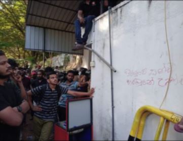 ඇතැම් සිසුන් අගමැතිගේ තාප්පය මත නැග සිය විරෝධය එල්ල කරන අතර නිලනිවෙසට ඇතුළුවන ගේට්ටුව අසල කළු කොඩි ඔසවා ඔවුහු විරෝධය දක්වනු ලැබුවා.