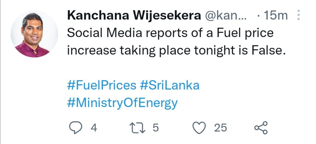 අද (24) මධ්‍යම රාත්‍රීයේ යළි ඉන්ධන මිල ඉහල දමන බවට පළවන වාර්තා අසත්‍ය බව විෂය භාර අමාත්‍ය කංචන විජේසේකර පවසනවා .