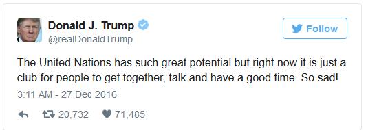 ලබන 20 වනදා සිට ඇමරිකානු ජනපති පදවිය භාරගන්නට සූදානමින් සිටින ඩොනල්ඩ් ට්‍රම්ප් එක්සත් ජාතීන්ගේ සංවිධානය විවේචනය කරමින් ප්‍රකාශයක් නිකුත් කිරීම නිසා ආන්දෝලනයක් ඇති කර තිබේ.