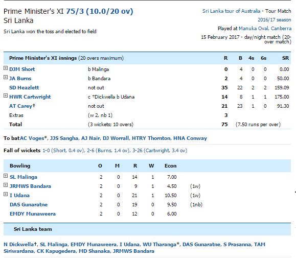 පන්දුවාර 10 ක් අවසානයේ කඩුලු 03 ක් පමණක් දැවී ඔස්ට්රේලියා අගමැතිගේ කණ්ඩායම ලකුණු 75 ක් රැස් කරගෙන සිටියි..