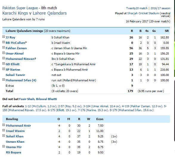 පාකිස්ථාන ප්‍රිමීයර් ලීග් විස්සයි විස්ස තරගාවලියේ ඊයේ (16) පැවති අටවැනි තරගය කුමාර් සංගක්කාර ක්‍රීඩා කරන කරච්චි කණ්ඩායම ලාහොර් කණඩායම හමුවේ ලකුණූ 07 කින් පාරාජයට පත් විය.