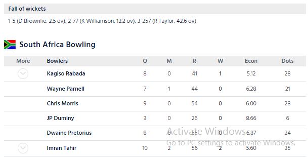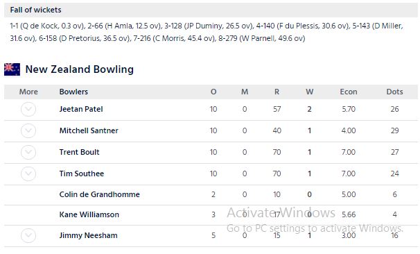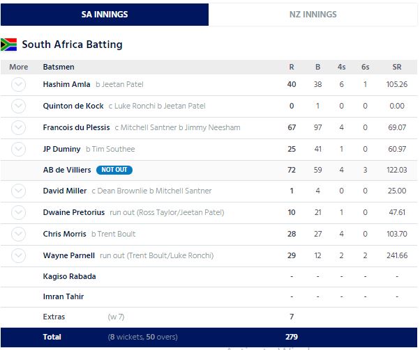 කාසියේ වාසිය දිනා පළමුව පන්දුවට පහර දුන් දකුණු අප්‍රිකා කණෟඩායම සිය පන්දුවාර 50 අවසානයේ කඩුළු 08 ක් පමණක් දැවී ලකුණු 279 ක් රැස් කර ගත්තේය.