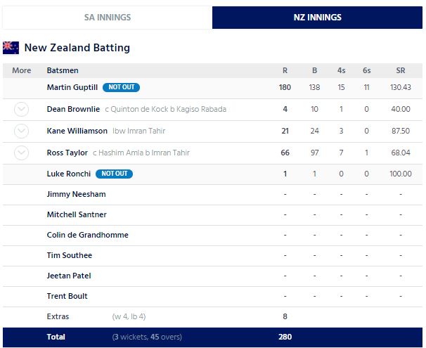 නවසීලන්තය වෙනුවෙන් කැපී පෙනන ඉනිමක් ක්‍රීඩා කළ මාර්ටින් ගප්ටිල්  හයේ පහර 11ක් හා හතරේ පහර 15 ක් සමගින් පන්දු 198 ක් තුළ නොදැවී අගනා ලකුණූ 180 ක් ලබා ගැනීමට සමත් වුයේය.