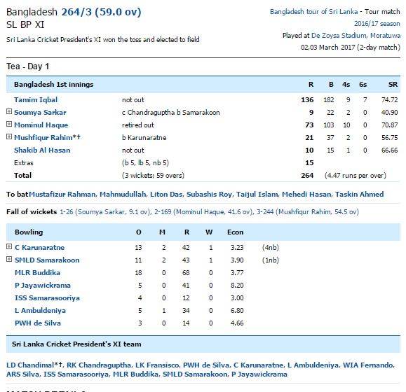 ශ්‍රී ලංකා ක්‍රීකට් සභාපතිවරයාගේ කණ්ඩායම සමග මොරටුව ද සොයිසා ක්‍රීඩාංගනයේදී අද (02) ආරම්භ වු දෙදින ක්‍රිකට් තරගයේ පළමු ඉනිම ක්‍රීඩා කරන බංගලාදේශ කණ්ඩායම තේ පානය සඳහා තරගය අත්හිටුවන විට කඩුළු  04 ක්  දැවී ලකුණු 264 ක් රැස් කර ගැනීමට සමත්ව සිටියේය.