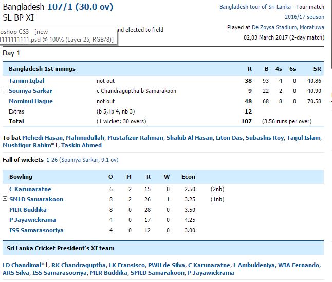 ශ්‍රී ලංකා ක්‍රීකට් සභාපතිවරයාගේ කණ්ඩායම සමග මොරටුව ද සොයිසා ක්‍රීඩාංගනයේදී අද (02) ආරම්භ වු දෙදින ක්‍රිකට් තරගයේ පළමු ඉනිම ක්‍රීඩා කරන බංගලාදේශ කණ්ඩායම දිවා අහාරය සඳහා තරගය අත්හිටුවන විට එක් කඩුල්ලක් පමණක්  දැවී ලකුණු 107 ක් රැස් කර ගැනීමට සමත්ව සිටියේය.