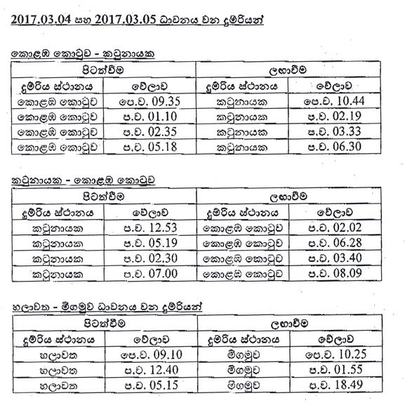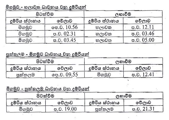 මෙ හේතුවෙන් එම කාල සීමාව තුළ මීගමුව – හලාවත හා පුත්තලම අතර හා කොළඹ කොටුව – කටුනායක අතර විශේෂ දුම්රියක් ධාවනය කෙරෙන බව දුම්රිය දෙපාර්තුමේන්තුව වැඩි දුරටත් සඳහන් කරයි.