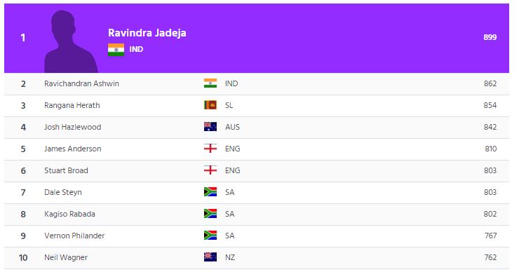 මෙතෙක් එහි පළමු ස්ථානයේ සිටි ඉන්දීය ක්රීඩක රවීචන්ද්රන් අශ්වින්ව දෙවැනි ස්ථානය දක්වා පසු බස්වමීන් ජඩේජා ශ්රේණිගත කිරිම් හිනිපෙත්තටම පැමීණිමට සමත්ව තිබේ.