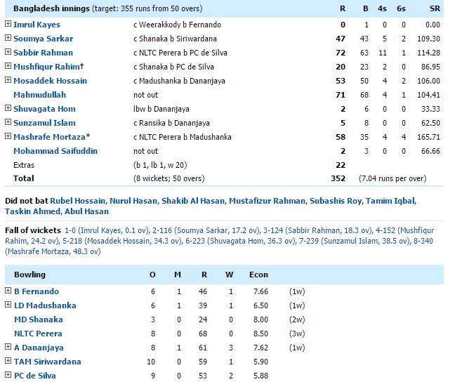 තරගයේ ලකුණු 354 ක දැවැන්ත ඉලක්කය හඹා යෑම පැමීණි බංගලාදේශ ඉනිම ලකුණු 352 කට සිමා කිරීමට ශ්රී ලංකා පන්දු යවන්නෝ සමත්වූහ.