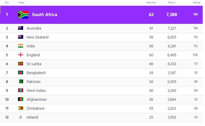 බංග්ලාදේශය සමඟ දඹුල්ලේදී පැවැති පළමු එක්‌දින තරගය පරාජය වීමත් සමඟ එක්‌දින ශ්‍රේණියේ ප්‍රසාද ලකුණු 98 ක්‌ හිමිව තිබූ ශ්‍රී ලංකාවට එක්‌ ලකුණක්‌ අහිමි වෙද්දී ප්‍රසාද ලකුණු 91 ක්‌ ලබා සිටි බංග්ලාදේශයට තවත් ප්‍රසාද ලකුණු දෙකක්‌ එක්‌ව තිබේ.