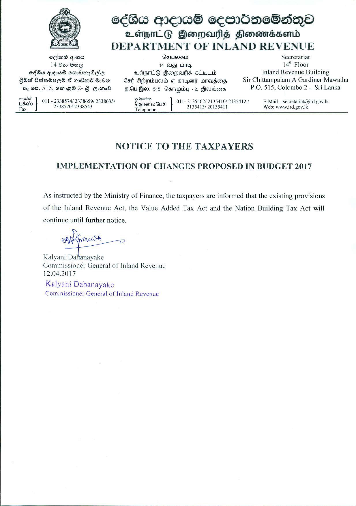 ආදායම් කොමසාරිස්ගෙන් බදු ගෙවන්නන්ට නිවේදනයක්..