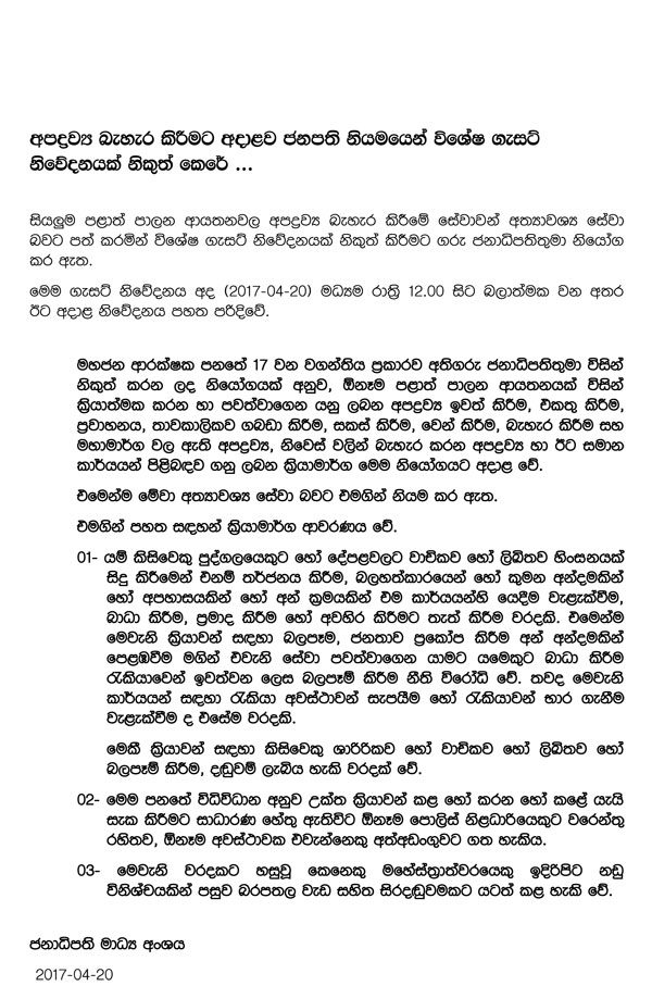 අපද්රව්ය බැහැර කිරීම විශේෂ කර ජනපතිගෙන් ගැසට්ටුවක්..