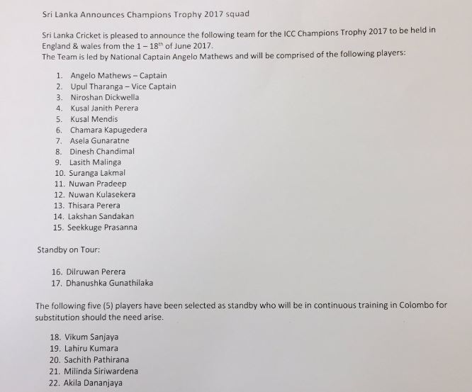 ජුනි මස 01 වැනිදා සිට ජුනි මස 18 වැනිදා දක්වා වෙල්සයේ පැවැත්වෙන අයි.සී.සී චැම්පියන්ස් කුසලාන එක්දින තරගාවලිය සඳහා වු ශ්රී ලංකා සංචිතය මීට සුළු මොහොතකට පෙර ශ්රී ලංකා ක්රිකට් ආයතනය නිවේදනය කර සිටියේය.