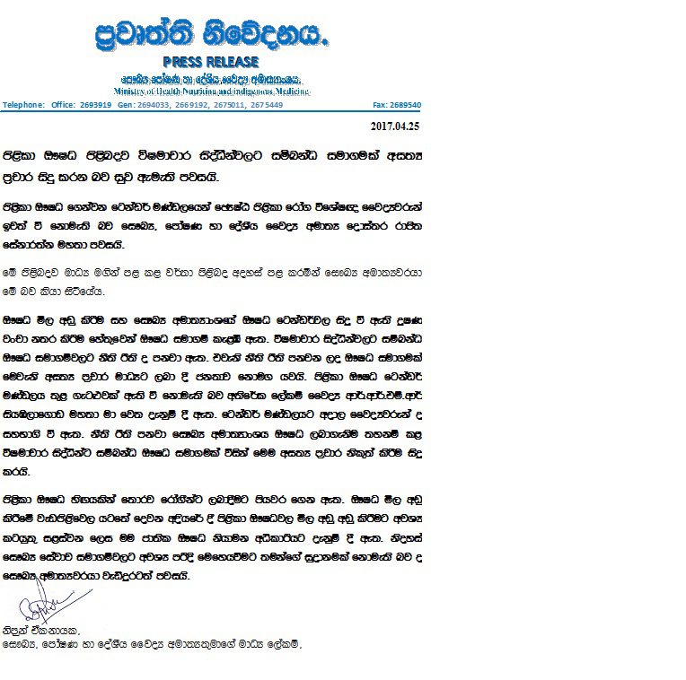 පිළිකා ඖෂධ ගෙන්වන ටෙන්ඩර් මණ්ඩලයෙන් ඡ්‍යෙෂ්ඨ පිළිකා රෝග විශේෂඥ වෛද්‍යවරුන් ඉවත් වී නොමැති බව සෞඛ්‍ය, පෝෂණ හා දේශීය වෛද්‍ය අමාත්‍ය දොස්තර රාජිත සේනාරත්න මහතා නිවේදනයක් නිකුත් කරමීන් සඳහන් කර සිටියි.