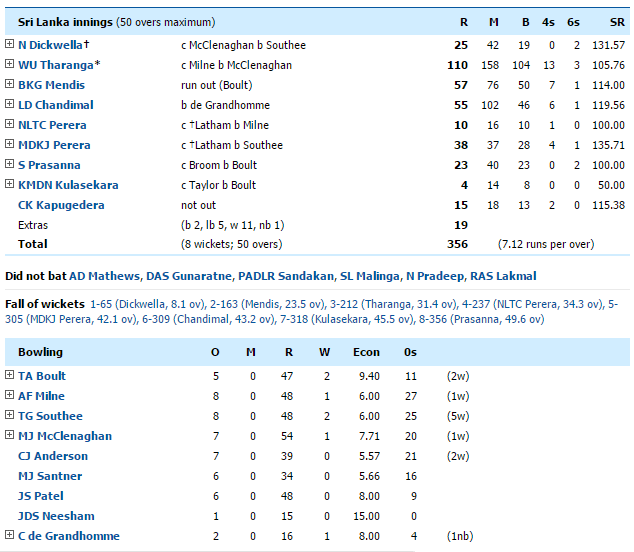 කාසියේ වාසිය දිනු නවසීලන්ත ආරාධනයෙන් ප්රථමයෙන් පන්දුවට පහරදුන් ශ්රී ලංකා කණ්ඩායම කඩුළු 08 ක් පමණක් දැවි සිය පන්දුවාර 50 අවසානයේ ලකුණු 356 ක් රැස් කර ගැනීමට සමත් විය.