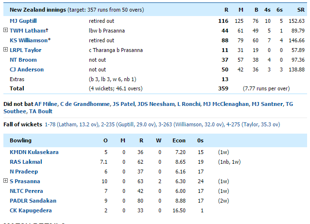 එ අනුව ලකුණු 357 ක ජයග්රාහී ඉලක්කයක් හඹාගිය නවසීලන්ත පිතිකරුවෝ පන්දුවාර 46 යි 01 ක් පන්දුවක් තුළ සිය ජයග්රාහී ඉල්ලකය සපුරා ගැනීමට සමත් වුහ.