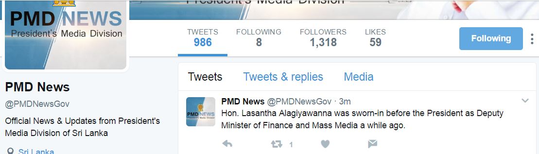 මහනගර සහ බස්නාහිර සංවර්ධන නියෝජ්ය අමාත්ය ලසන්ත අලගියවන්න මහතාව ජනාධිපතිවරයා විසින් මුදල් හා ජනමාධ්ය නියෝජ්ය අමාත්යවරයා ලෙස පත් කළ බව වාර්තා වේ.