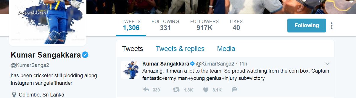 එසේම තමන් විචාරක කුටියේ සිය අභිමානයෙන් ශ්රී ලංකා ජයග්රහණය වින්දනය කළ බවත්, ජයග්රහණයට හේතුවු ශ්රී ලංකා කණ්ඩායමේ කැපවීමේ සුත්රයක්ද සංගාකාර එහි සඳහන් කර තිබේ.